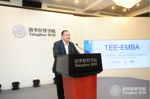 清华经管学院党委书记高建教授在致辞中说,“由清华经管学院与法国国立路桥大学、法国国立民航大学联合开办的TEE-EMBA项目是三所院校的首次合作,是中法两国在科技界和教育领域的一项创举,也是中法两国建交五十周年的见证。”他还表示,TEE-EMBA项目至今已经成功举办三期,2016级的课程在原有课程体系的基础上大胆创新,利用清华经管教学资源大平台的优势,将项目涵盖的工商管理类课程与清华经管EMBA教育进行整合,借鉴EMBA教育“天、地、人、通”的教学理念,与EMBA项目资源共享的同时,发挥国际合作项目的优势,充分将中西方管理理念融会贯通,帮助学生建立全球化的视野,从国际视角聚焦中国,乃至整个亚洲的发展。