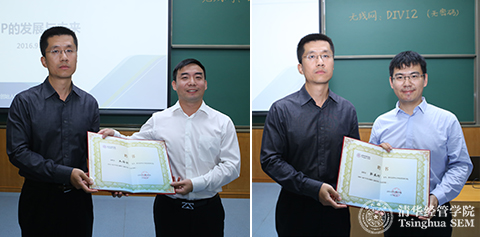 清华经管学院副院长徐心教授为中国金融四十人论坛秘书长王海明(左)、人人贷联合创始人张适时(右)颁发金融硕士行业导师聘书