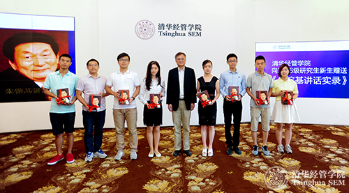 钱颖一院长代表清华经管学院在清华MBA开学典礼上向2016级MBA新生赠送《朱镕基讲话实录》