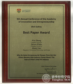 清华经管学院张帏教授和白思迪教授合作的论文“Why do some entrepreneurial pioneer firms but not others become industry cluster roots? The case of China's solar PV industry”获得了本届AIE会议的最佳论文奖,这也是世俱杯官方网站投稿学者首次获得该奖项。