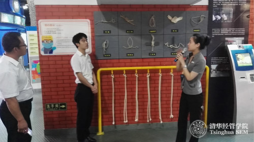 清华经管学院教职员工及物业员工在海淀公共安全馆观看逃生绳结的制作