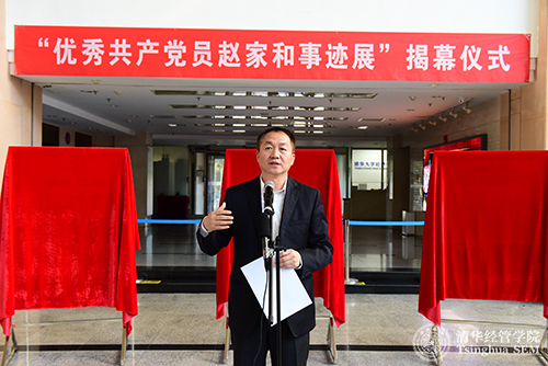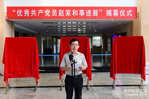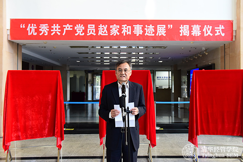 随后,清华经管学院党委书记高建教授发言。他在发言中说,“赵家和是中国共产党员、清华经管学院教授。他一生忠于党的教育事业,不仅全心全意投入于教书育人,学高德厚;而且捐资助学,大爱无疆,是我们身边的学习榜样。”高建教授从四个方面为大家讲述了赵家和教授求学、育人、倾力助学的一生。高建教授说,当前,“两学一做”活动正在开展,经管学院的文化建设正在进行,赵家和的事迹和精神是每位党员学习和对照的典范,传承赵家和的精神也是经管学院文化建设的一个重要组成部分。他希望学院全体师生员工通过参观学习赵家和的先进事迹,向优秀看齐,共同践行学院使命,创造美好未来。