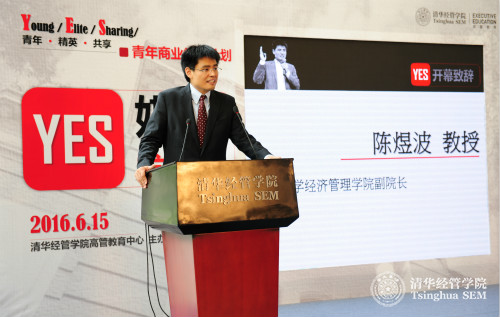 清华经管学院副院长陈煜波教授在清华经管学院“YES青年商业领袖计划”启动仪式上致开幕词
