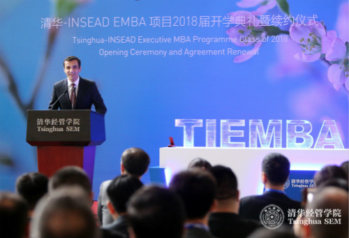 英士国际商学院(INSEAD)院长伊利安·米霍夫(Ilian Mihov)教授在清华-INSEAD双学位EMBA项目2018届开学典礼暨续约仪式上致辞