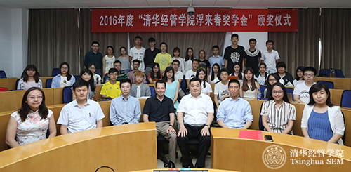 2016年6月3日,2016年度“清华经管学院浮来春奖学金”颁奖仪式在学院举行。此次共有31名同学获得本年度奖学金。浮来春集团董事长武玉杰(EMBA2013)也来到现场为同学们颁奖,并与大家展开了深入交流。