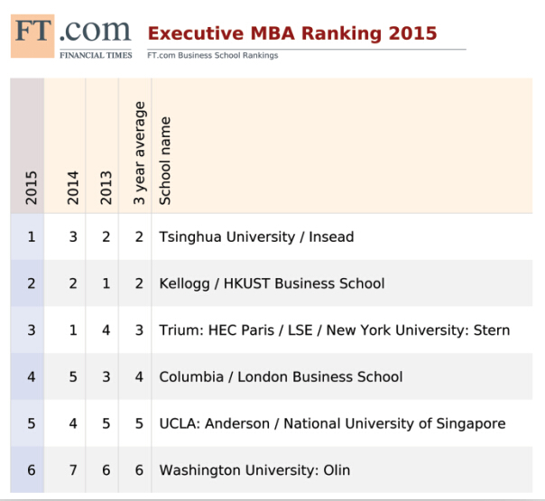 The joint programme delivered by Tsinghua and Insead University (Tiemba) moved up two places to lead the 2015 global executive MBA ranking, dethroning Trium, which drops back to third place after only one year at the top.