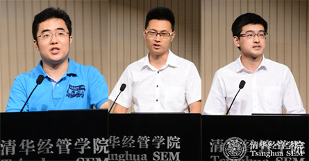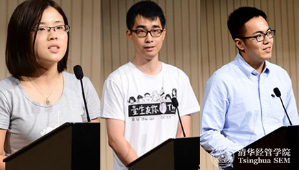 新生发言(左起):2015级管理科学与工程系博士研究生管悦(本科毕业于清华经管学院)、2015级管理硕士研究生林昊(本科毕业于清华化工系)和2015级经济系硕士研究生黎柯岩(本科毕业于复旦大学经济学院)
