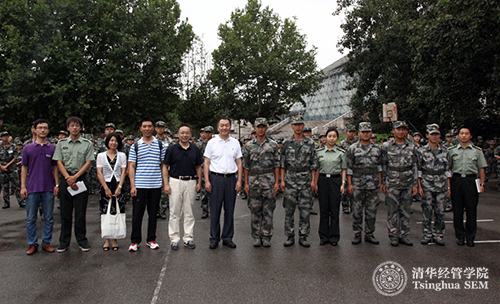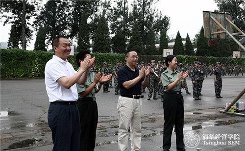 清华经管学院党委书记高建教授(左一)和党委副书记焦捷教授(左三)为新生们加油鼓劲