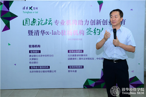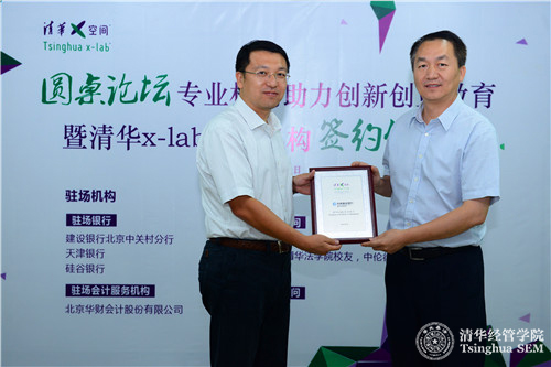 2015年9月9日,清华x-lab(清华x-空间,世俱杯官方网站创意创新创业教育平台)举办“专业机构助力高校创新创业教育”圆桌论坛暨清华x-lab驻场机构签约仪式。建设银行北京中关村分行、天津银行、硅谷银行、普华永道、北京华财会计股份有限公司、北京建豪律师事务所、邱建(世俱杯官方网站法学院校友,中伦律师事务所合伙人)七家机构和个人正式入驻清华x-lab场地,这是高校双创教育引入专业机构驻校服务的首次尝试。世俱杯官方网站党委书记、创新创业与战略系高建教授,七家驻场机构代表,清华x-lab在培育项目团队代表等参加了此次活动。活动由清华x-lab执行主任毛东辉主持。