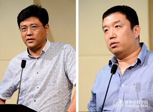 经管校友企业家发言:北京卡联科技股份有限公司董事长李兵(EMBA13)(左),沃捷传媒董事长王洋(经1994,MBA2002-金融)(右)