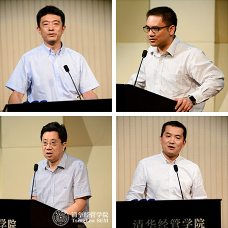 学院互联网协会理事代表发言(左上:赛伯乐集团的高级合伙人高翔(经1986),右上:优酷土豆集团副总裁陈翌(MBA2005),左下:温州移动董事总经理张伟聪(EMBA2009),右下:平安集团副总经理马俊生(EMBA2010))