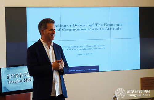 在第二天的会议中,来自乔治梅森大学(George Mason University)的Daniel Houser教授作了题为“强硬还是顺从?有态度交流的经济价值(Demanding or Deferring? The Economic Value of Communication with Attitude)”的演讲。在纯协作博弈中,只有当博弈双方进行相同的选择时,才能获得正收益。假如不允许任意的讨论,而只允许双方同时发出一个信号来进行交流,那么什么样的信息才能保证得到正的收益均衡呢?Houser教授指出,人们使用二维信号(即同时包括自己想做的选择和坚持自己选择的强硬程度)的效果要优于一维信号,而且最终的博弈结果是双方都会跟随态度更强者的选择。然后他通过实验设计证明了相关结论。