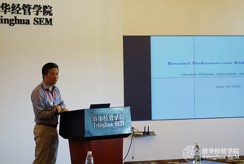 在第一天的会议中,清华经管学院经济系系副主任钟笑寒教授首先致辞。之后,来自英国牛津大学(University of Oxford)的John K.-H. Quah教授作了题为“关于风险和不确定性的显示性偏好(Revealed Preferences over Risk and Uncertainty)”的主旨演讲。Quah教授介绍了一种在不确定性下检验消费者所做的实际选择集合是否可以被性质良好的效用函数理性化的一般性方法,并证明了这种检验只需在有限点阵(finite lattice)下进行即可。同时,他利用数据检验了不同的风险效用理论与人实际行为的契合程度,并得到了衡量非理性程度的成本效率指标(Critical Cost Efficiency Index)。