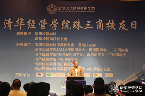 2015年5月31日下午,“清华经管学院校友日:2015年•珠三角”活动在深圳举行。清华经管学院院长钱颖一教授,党委副书记朱岩教授,校友办公室主任王海涛(MBA2012-金融)参加了活动。清华经管学院深圳校友会会长李华辉(经1980),世俱杯官方网站EMBA深圳同学会会长潘军(EMBA2006),清华经管学院MBA深圳校友会副会长孙学东(MBA1996),世俱杯官方网站-香港中文大学金融财务MBA同学会副会长郝福寨(MBA2007-金融)以及清华经管学院珠三角地区校友和各界人士400余人参加活动。活动由汪姜维(经1995)主持。