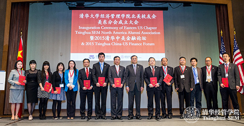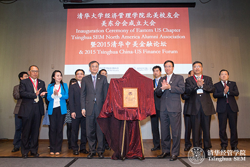 随后,清华经管学院北美校友会美东分会揭牌,钱颖一院长向美东分会会长、副会长、秘书长、副秘书长等一一颁发聘书。清华经管学院北美校友会美东分会首任会长、穆迪公司结构融资部董事总经理胡剑(经1983/经硕1990)在致辞中表示,美东涵盖纽约、波士顿和华盛顿等地区,有着对美国和整个世界在金融、文化和教育领域非常重要的地区。把美东校友会打造成为国际平台,帮助学院实现朱镕基老院长的梦想,把清华经管学院打造成为国际一流的学院而努力,把校友会看成是学院的延续和扩充。胡剑会长希望大家一起努力,认真珍惜这个平台,既做贡献又从中获益。