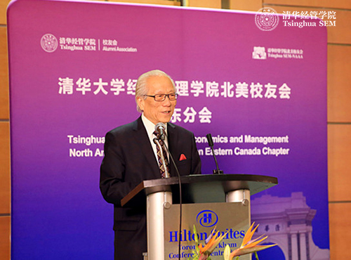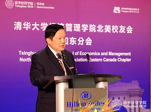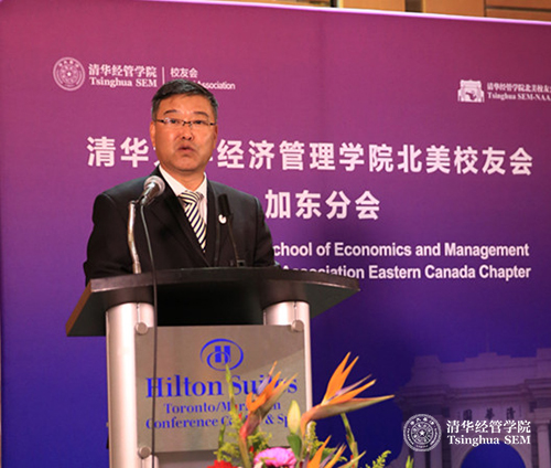 随后,清华经管学院院长钱颖一教授致辞,他指出,北美校友会的成立不仅是学院校友工作的重要发展,更是学院全球化战略的重要步骤。学院最早的一个国际合作项目就起源于加拿大:1994年在加拿大国际开发署(CIDA)的大力支持下,学院举办了国际化的本科会计项目。在海外建立校友会,是当前清华经管学院全球战略的重要一步。校友的需求和学院的全球战略的结合,是促成学院北美校友会成立的动因。北美校友会是继香港校友会和东南亚校友会之后成立的第三个海外校友会,是海外规模最大的校友会。选择多伦多为北美校友会加东分会所在地,是因为这里是加拿大东部的中心。最后,钱颖一院长对筹办北美校友会中做出贡献的校友表达了感谢,同时,感谢前来参加北美校友会加东分会成立大会的嘉宾与校友,并对北美校友会的未来表示期待。