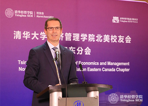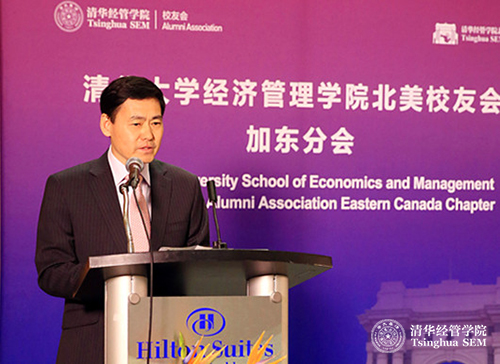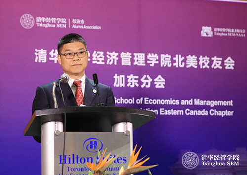 颁发聘书结束,清华经管学院北美校友会加东分会会长孙东辉(EMBA2002)致辞。他表示,加东校友们一直以来都强烈盼望母校成立海外校友会,感谢钱院长一行给加东校友带来了母校的关怀,感谢学院搭建平台。加东分会将广泛的团结校友,加强校友间的沟通交流,回馈学院,报答祖国。