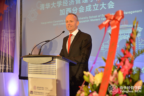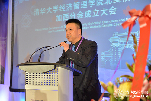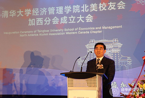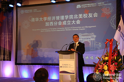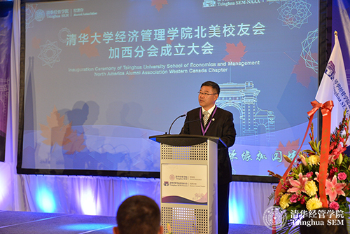 随后,清华经管学院院长钱颖一教授致辞,他指出,北美校友会的成立不仅是学院校友工作的重要发展,更是学院全球化战略的重要步骤。在海外建立校友会,是当前清华经管学院全球战略的重要一步。校友的需求和学院的全球战略的结合,是促成学院北美校友会成立的动因。北美校友会是继香港校友会和东南亚校友会之后成立的第三个海外校友会,是海外规模最大的校友会。加西(温哥华)分会是继美西(旧金山)分会、美东(纽约)分会、加东(多伦多)分会成立后,是此次学院北美校友会成立的最后一站,是一个里程碑。钱院长特别指出,加西分会成立大会的来宾中有多所国内大学在加拿大和温哥华校友会的代表,这充分体现了各大学校友们对清华经管学院的情谊。最后,钱院长代表学院感谢所有为清华经管学院北美校友会成立做出贡献的校友,并表达了对北美校友会未来的期待。