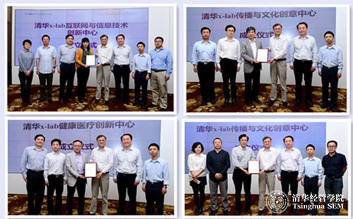 从左上到右下依次为:清华x-空间(x-lab)互联网与信息技术创新中心、清华x-空间(x-lab)环保创新中心、清华x-空间(x-lab)健康医疗创新中心和传播与文化产业中心启动,清华经管学院院长钱颖一教授、清华经管学院党委书记、副院长高建教授与各相关共建院系负责人合影