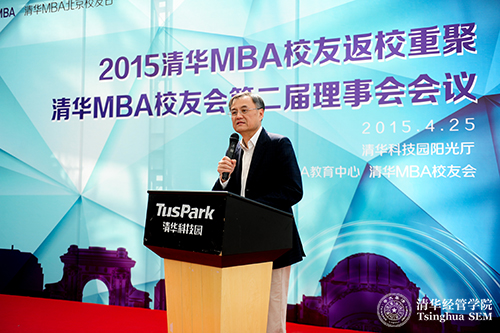 钱颖一院长在致辞中回顾和总结了清华MBA校友会三年工作。他说,清华MBA校友会自2011年7月16日恢复成立以来,在清华经管学院和清华校友总会领导下,坚持融合、开放、分享、共赢,在组织构建、平台建设、活动策划、校友服务和支持学院等方面圆满完成战略任务。期间,校友理事发挥了核心作用,各项活动促进了校友融合与协作。理事会重视模式创新,形成并输出影响力,体现领导力。理事会团结各界校友,积极筹措资源,支持教学和学生培养,反哺母校,为MBA项目提供了全面支持。他说,校友会的工作是一个持续性的工作,是一份责任,对下一届理事会寄予厚望,希望在未来三年工作再上一个新台阶。