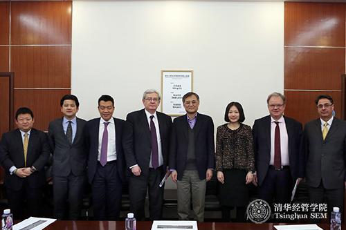 法国巴黎银行集团Jean Lemierre董事长一行访问清华经管学院(左起:法国巴黎银行集团资产管理公司中国区总经理Danny He、集团投资大中华区负责人Tan-Feng Cheng、大中华区负责人兼香港分行行政总裁Paul Yang、集团董事长Jean Lemierre、清华经管学院院长钱颖一教授、中国企业全球化研究中心主任贾宁教授、法国巴黎银行亚太区行政总裁Eric Raynaud、集团中国区首席代表Bruno Weill)