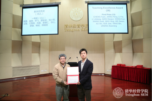 副院长白重恩教授向教学优秀奖一等奖获得者徐心教授颁发荣誉证书