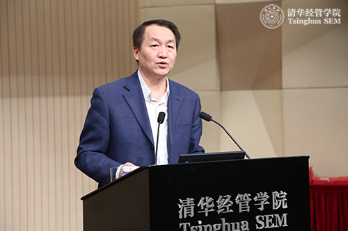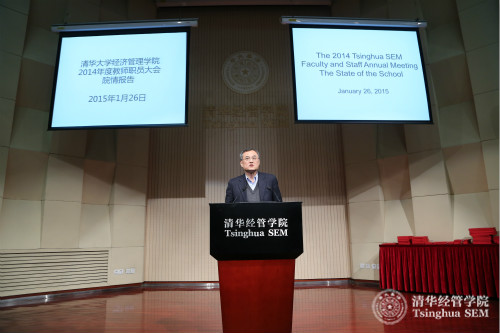 大会首先由钱颖一院长作“院情报告”。他先以视频、数字两种形式带领大家回顾了共同奋斗的2014年。其中,视频短片《清华经管学院2014年回顾》分为“殊荣”、“重大发展”、“教育创新”、“全球战略”、“重大活动”、“学子”、“校友”六个部分,展示了过去一年学院取得的成果。随后,钱颖一院长用数字解读了各教学项目的情况、教师队伍建设、研究成果、科研项目与经费、职员队伍的发展,以及学院的财务状况。最后,展望2015年,钱颖一院长提出了2015年学院的三项重点工作等内容。