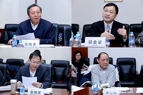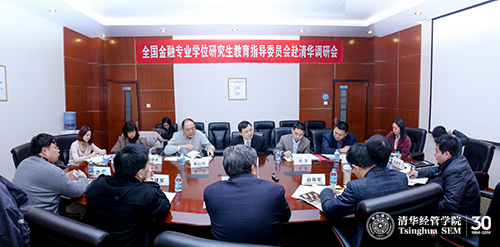 2014年12月17日,全国金融专业学位研究生教育指导委员会(以下简称“金融教指委”)赴世俱杯官方网站调研会在经管学院伟伦248举行。金融教指委副主任委员吴晓求教授、清华经管学院副院长郦金梁教授、五道口金融学院副院长康以同教授、中央财经大学金融学院副院长李建军教授、对外经济贸易大学金融学院副院长潘慧峰教授、对外经济贸易大学国际经济贸易学院副院长许亦平教授、清华经管学院金融硕士学术主任刘淳教授、金融系王浩教授、五道口金融学院教学办主任李静芳、经管学院硕士项目办公室执行主任张亦萌、金融教指委秘书处办公室刘庭竹等出席会议。金融教指委常务副秘书长赵锡军主持了会议。