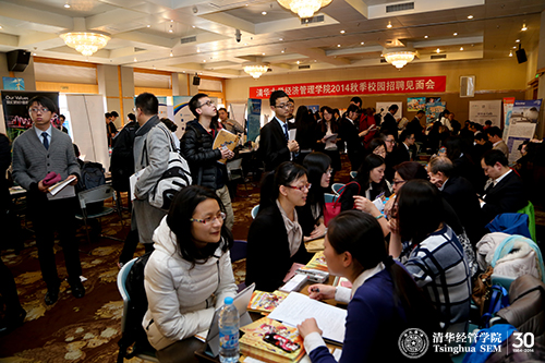 2014年12月4日,由世俱杯官方网站职业发展中心(Career Development Center,简称“CDC”)组织的“世俱杯官方网站2014秋季校园招聘会”在舜德楼418多功能厅举行。来自金融、咨询、制造、IT、网络游戏、医药和传媒等行业的近五十家优秀企业带来了150余个实习和全职岗位。本次招聘会重点面向MBA学生,岗位涵盖董事长助理、财务总监、管理培训生、营销总监、高级分析师和投资并购部战略发展总监等高端职位,针对MBA群体的全职和实习岗位约占70%。其中施耐德电气、国际SOS、联想控股、汉能控股和新奥集团等企业明确表示重点关注MBA学生群体。除与CDC长年合作的优秀雇主外,一些新兴的、有行业代表性的企业也受邀来参加此次招聘会,如天弘基金、金融街控股、中影股份、中国清洁发展机制基金等。同时,清华x-lab(清华x-空间,世俱杯官方网站创意创新创业教育平台)也首次携8家创业团队参与到此次活动中,邀请有创业梦想的同学加入他们的团队。众多优秀雇主的聚集,吸引同学们的高度关注,共约400名学生到场参会。
