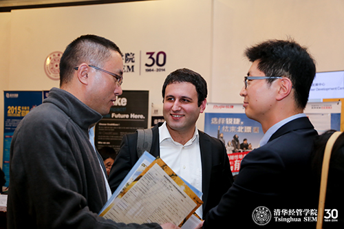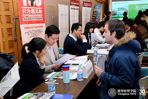 清华经管学院的MBA留学生在招聘会现场与雇主沟通