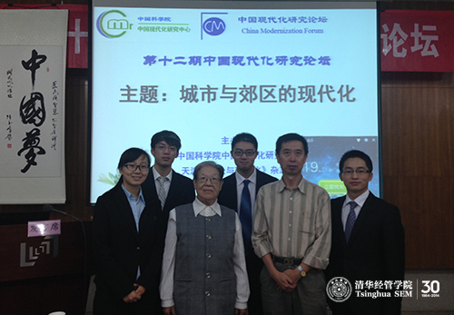 四位同学和中国科学院中国现代化研究中心主任何传启(右二)以及清华经管学院谢文蕙教授(前排右三)在会上的合影