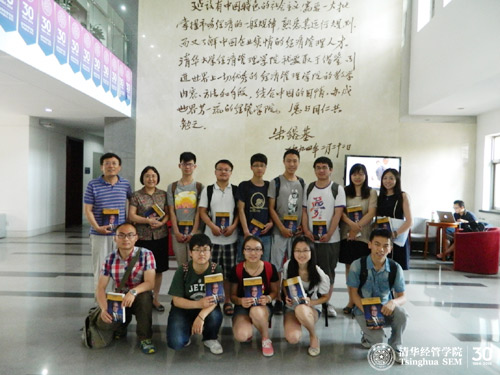 同学们在伟伦楼大厅与钱小军教授和潘庆中老师合影