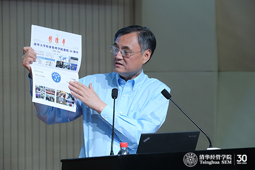 活动一开始,全体师生一同观看了4月26日学院建院30周年师生校友重聚共叙活动的短片,视频中师生校友汇聚一堂,共忆难忘家园——永远的清华经管学院。钱颖一院长由会场不设主席台从而拉近了师生距离等几处细节说起,向同学们展示了清华经管学院独特的文化。无论是经管学院同学们原创的歌曲,还是校友们的回馈与回忆,满满都是浓浓的情谊。