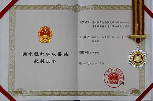 “通识教育与个性发展相结合——经济管理本科教育改革的理念与实践”获奖证书和徽章