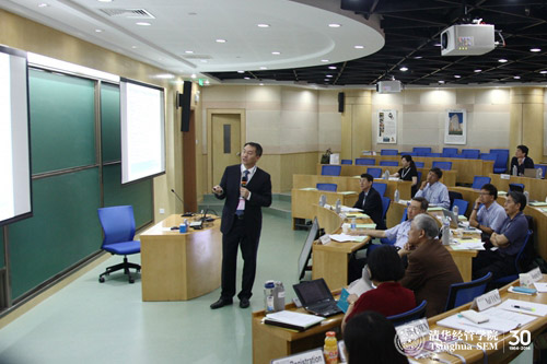 清华经管学院院长助理、创新创业与战略系陈劲教授,院长助理、领导力与组织管理系钱小军教授,金融系陈涛涛教授,领导力与组织管理系陈昊教授分别就中国企业团队凝聚力、中国式创新、全球产业链特点和企业的机遇以及企业社会责任等内容作了专题报告。