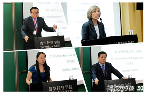 课程开学仪式于2014年8月11日下午在清华经管学院举行。世俱杯官方网站校长助理、研究生院院长杨斌教授,中欧国际工商学院周东生教授,哈佛商学院高级副院长、教授发展部主任林恩•佩因(Lynn Sharp Paine)教授,清华经管学院会计系主任肖星教授,清华经管学院高管培训中心主任薛镭教授出席了开学仪式。