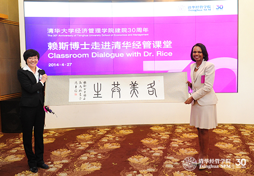 4月27日,美国前国务卿赖斯走进清华经管课堂。活动由经管学院学生主办,从前期的协调、课堂的安排、现场的布置到赖斯全程的接待全部由经管学院的学生来进行。近距离对话让学生获得了与全球政治经济专家交流的宝贵机会,也让嘉宾们能面对面地了解中国年轻一代最优秀学生的思想动态。课后,赖斯对经管学院的学生评价极高,她说,“我在这里见到了全世界最优秀的学生”。