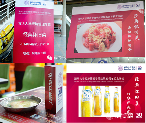 既要符合“八项规定”,又要让师生校友对重聚共叙活动后的午餐留下深刻印象,这是一个不小的挑战。一切都在创意中:学院精心设计了一场“经典怀旧菜”午餐,2000多人在十食堂(现称“听涛园”)和万人食堂(现称“观畴园”)同时就餐。菜单中有烧茄子、青椒土豆丝、土豆烧牛肉、木须肉、还有北冰洋汽水,把校友们带回到当年的学生时代。这虽是一次极为俭朴的午餐,但是充满了对青春的回忆,对学生时代的怀旧,和对“食在清华”的致意。