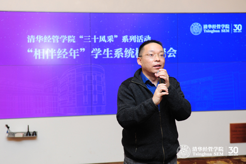 曾担任学生辅导员的金融系张陶伟(经博1994)教授也深情回忆起当年的学生工作经历。他讲述了清华经管同学勇于参与社会实践和学校改革的例子,还回忆起当年在潘福祥学长在参与就“清华要不要进行改革”而进行的声势浩大的辩论时,清华经管学院的同学则自发围成“人墙”保护潘福祥使其避免因人潮的冲击。这些事情都对他的触动很大,深受感动之余更是感受到了清华和清华经管学院独有的精神力量。他希望清华的学生工作者能够将这种精神代代传承下去。