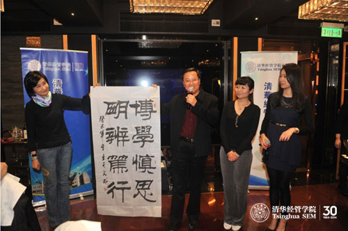 清华经管香港校友会王天义(经硕1985/经博1995)会长在致辞中赞扬了香港院友们的凝聚力和理事会理事们的战斗力。他希望在港院友能充分利用校友会这个交流平台,加强联系和合作,交流思想和情感,并将其发展壮大。身为中国书法家协会会员的王天义学长献出自己的墨宝,由吴小莉校友在新生中抽奖,最终赠予了EMBA新校友李青。