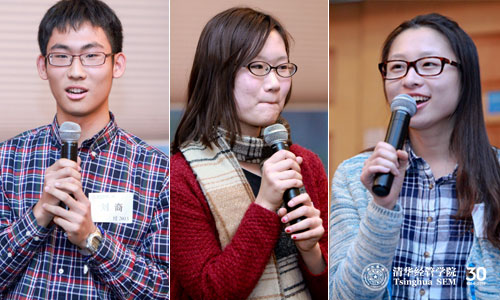 三位由程老师亲自招收入清华的在校同学也来到了活动现场。刘裔(经2013)班称自己是“3字班”的新生,对程老师把自己领进经管表示感谢,也从小事讲述了对程老师对学生的关爱。来自新闻与传播学院2013级的白玉同学说,程老师永远会系一条丝巾,耐心地回答别人的问题,“大概一个优雅的女人就是这样的吧。”杨梦(经2010)称程老师为自己的偶像,因为想成为程老师一样的女人而来到经管。并祝福程老师一直优雅地走下去。