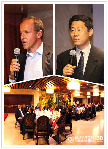 第三期培训课程的欢迎晚宴在清华科技园启迪俱乐部举办。宝马(中国)服务有限公司高级副总裁菲利浦•埃勒(Philip Christian Eller)先生,清华经管学院中国与世界经济研究中心主任、弗里曼讲席教授李稻葵教授、清华经管学院高层管理人员培训中心副主任谢绮红老师与参加本次培训的30名宝马高级管理人员一同出席了晚宴。菲利浦•埃勒先生和李稻葵教授分别为晚宴致辞。