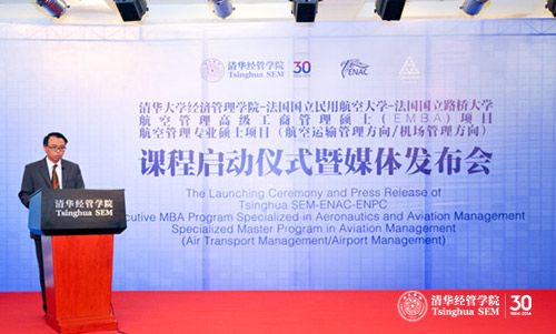 清华经管学院党委副书记朱岩教授,法国国立民用航空大学校长Marc Houalla先生,法国国立路桥大学中方代表Kirsty Tan女士,欧洲宇航防务集团(EADS)中国区总裁及首席执行官Laurence Barron先生,国际租赁金融公司(ILFC)高级副总裁及中国区总裁Peter Chang先生出席发布会并致辞。他们共同宣布,将通过各自的资源优势,协力打造中国最顶尖的航空管理课程。清华经管学院高管培训中心副主任谢绮红主持了此次课程启动仪式暨媒体发布会。