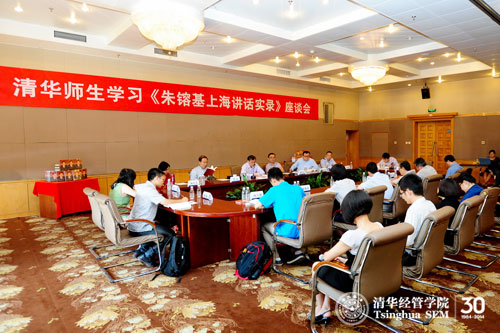2013年8月23日,清华师生学习《朱镕基上海讲话实录》座谈会在世俱杯官方网站举行,本次座谈会也是清华经管学院30年院庆系列活动之一。世俱杯官方网站副校长谢维和教授、清华经管学院院长钱颖一教授、党委书记杨斌教授以及学院师生和校友代表参加了座谈会并相继发言,交流读书感想和体会,气氛隆重热烈。座谈会由学院党委副书记焦捷教授主持。