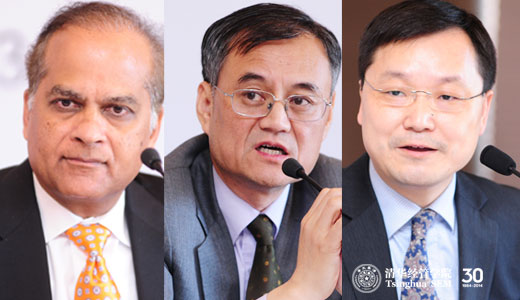 从左至右:麻省理工斯隆管理学院(MIT Sloan)常务副院长S.P. Kothari教授、清华经管学院院长钱颖一教授、清华经管学院副院长郦金梁教授
