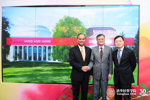 从左至右分别为:麻省理工斯隆管理学院(MIT Sloan)常务副院长S.P. Kothari教授、清华经管学院院长钱颖一教授、清华经管学院副院长郦金梁教授