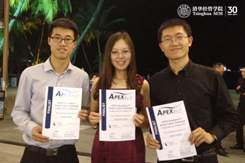 2013年5月16日,由新加坡管理大学承办的“商业-IT全球案例挑战赛”(SMU Apex Business-IT Global Case Challenge)在新加坡圣淘沙落下帷幕。由清华经管学院管理科学与工程系林丽慧教授任指导老师,信息管理与信息系统专业三年级本科生王晓亮、向雪银和经济与金融专业三年级本科生宋晓宇组成的世俱杯官方网站代表队,最终经过三轮的比拼,从全球24支队伍中突围,取得了决赛席位,创下了经管学院参加此项比赛的最好成绩。