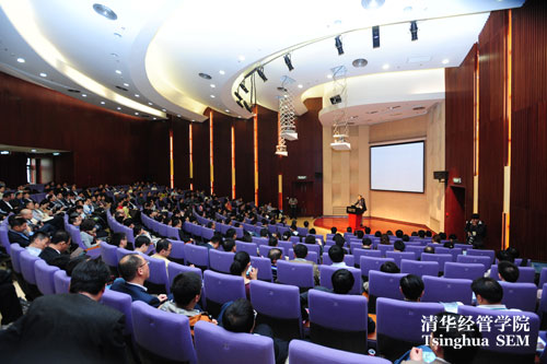 钱颖一院长首先代表学院发表了院情报告,他主要围绕本科教育改革、EMBA项目创新发展2012计划、与大学融合战略、教师人事制度改革、学院未来三年发展规划以及2014年30周年院庆活动等六个方面,向校友们较为全面地回顾介绍了学院近年来的重大改革创新及未来工作的重点。钱院长说,本科教育改革主要围绕通识教育、个性发展以及国际化三个方面开展,经过几年的实践探索,已取得广泛关注与认可;2012年是EMBA项目十周年,学院制定出“清华EMBA创新发展2012计划”,进行了从教学手段到课程体系的一系列创新;学院基于“大学中的商学院”的独特优势,创造性地推出“MBA+X”双学位项目,即将开设的管理学、工商管理专业的本科第二学位,并在过去的一年开展了“走进商学院”和“走出商学院”系列论坛,加强与大学其他院系更好的融合交流。钱院长特别隆重地介绍了就在两天前在同一地点启动的清华“x-lab”项目,该项目以经管学院为主,与其他11所清华院系合作共建,是一个创意、创新、创业人才的培养和发现平台,本身也是一个重要的教育创新;学院领先全校乃至全国的教师人事制度改革获得多方肯定,2012年被列为学校深化人事制度改革的试点单位,将有秩序地稳步推进;花了半年多的时间群策群力所制定的学院2013-2015三年战略规划,选择了大师、大楼、博士生培养改革、更高层次的国际化、经济学科加快发展、管理学科与大学融合等六项重点工作进行突破。整个院情报告有思想,有数据,有问题,有展望,在场校友听得聚精会神。