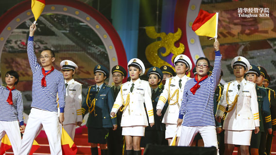 清华EMBA第八期媒体班则给大家带来了一场舞剧,名为《启航中国》,以甲午战争中邓世昌指挥作战开始,“穿越”到当今我国国防力量的不断提升,威震世界,最终以男女兵三军方阵飒爽的舞姿和2012年火爆的“航母STYLE”结束,短短的几分钟内讲述了中国的航母发展史,引来台下阵阵喝彩。