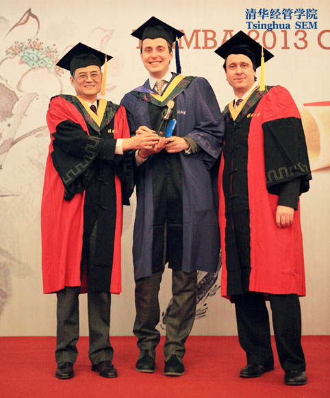 毕业典礼表彰了班级中GPA最高的两位同学以及论文成绩排在前三位的同学。在激动人心的学位授予仪式上,身穿学位服的同学们,从两位院长的手中接过了学位证书,这标志着他们圆满地结束了自己在清华、在经管学院、在TIEMBA项目的学习。